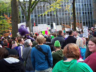 I attended Portland's Proposition 8 protest this morning at Portland State University. Our weather took a break from the normal dark gloom of the rainy season and instead gave us sun and was a beautiful day. Also beautiful was the large group that gathered in downtown Portland in solidarity against the politics of hate and discrimination that has prevailed in this country.